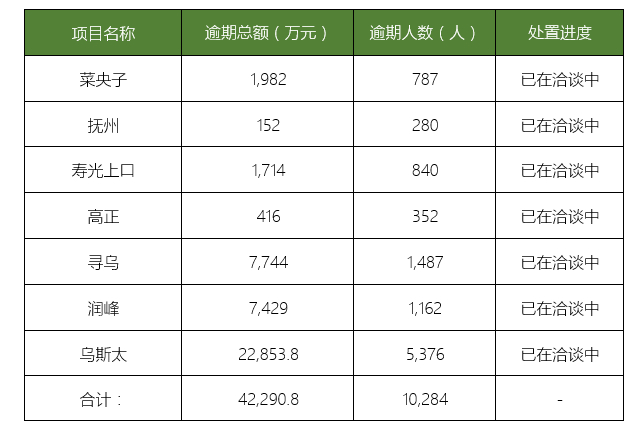 接下來,我公司將繼續(xù)不遺余力地執(zhí)行以項目劃分的兌付工作,以菜央子、撫州、壽光上口、高正、烏斯太、尋烏、潤峰等項目為重點。